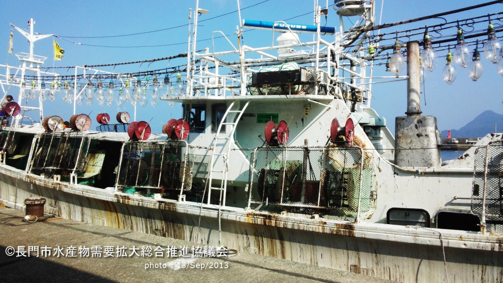 仙崎女性部のふたりが水揚げを手伝っていますよ。「あれ、今日はどしたんすか?」と伺えば、人手が足らないから手伝いに来ているんだって。刺網漁とかご網漁の漁師さんのご婦人も、ケンサキイカのお手伝い。チームながとでしょ!